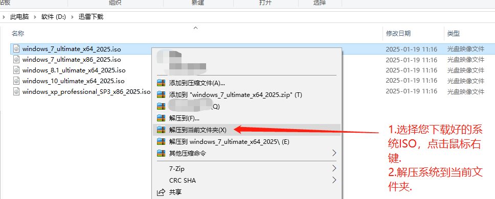 一、使用压缩软件→右键解压已下载的ISO文件到非系统盘(如下图:D\迅雷下载)外的其他盘符目录下;